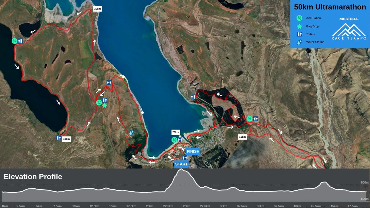 When you start you head towards the Regional Park, where you get to go over the arched pedestrian bridge. You will run right beside the world-famous Church of The Good Shepherd, and run through the forest on your way to Sawdon Station. Competitors in the Ultra Marathon get to run on the Lagoon Loop, a scenic trail that takes you over the true Mackenzie landscape on the iconic Sawdon Station. Once you have completed this section you then run through the Regional Park. This is a well-kept secret in Tekapo - trails that run under towering trees, where you get snippets of the lake and out towards the mountains. You will then join the side of Lake Tekapo and come back through the Race Village before heading towards Mt John. You will head up Mt John behind Tekapo Springs. Mt John is part of Balmoral Station, and as you continue on the course you will get to rejoin this station further along. Once you reach the summit you will pass the Mt John Observatory. At this point you will be breathless from not only the ascent, but the 360 degree views across the southern alps, Lake Tekapo, and Lake Alexandrina. The 50km course continues to impress as you descend Mt John via the Mt John access road. You will then take Godley Peaks Road for about 2km before accessing the Peninsula Walkway as part of Glenmore Station. You will cross the farmland on the west side of Lake Tekapo, before turning alongside Lake McGregor. You will run past Lake McGregor to the outlet of Lake Alexandrina. You then join Balmoral Station again as you make your way around this scenic lake, getting to appreciate the sheer scale of this iconic high country station. As you pass the Lake Alexandrina huts on the south side of the lake, you will then head back towards Mt John. You will cross back over Godley Peaks Road and head back up Mt John using the access road. At this point you are well on the way home. As you descend Mt John you run along the side of Lake Tekapo, taking you back to the Race Village.